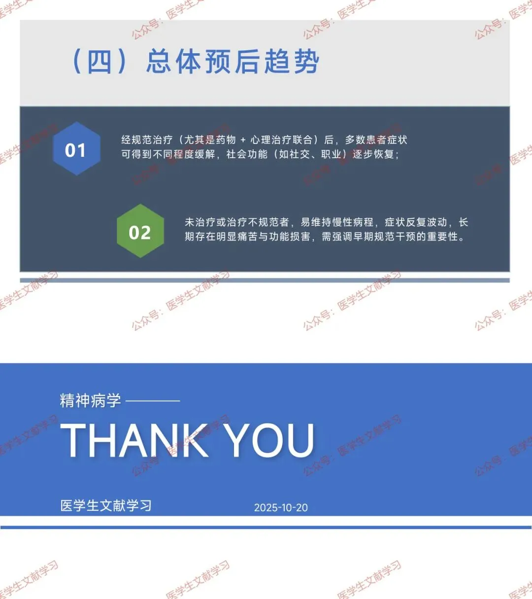 - 总体趋势:规范治疗(尤其药物 + 心理治疗联合)后,多数患者症状缓解,社会功能逐步恢复;未治疗或治疗不规范者,易维持慢性病程,需强调早期规范干预的重要性。