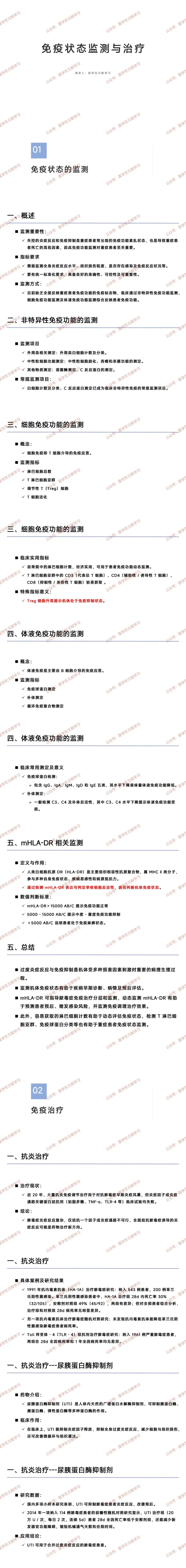 - 监测方式:无单一全面的免疫标志物,临床通过非特异性、细胞免疫、体液免疫监测及 mHLA-DR 检测综合评估。