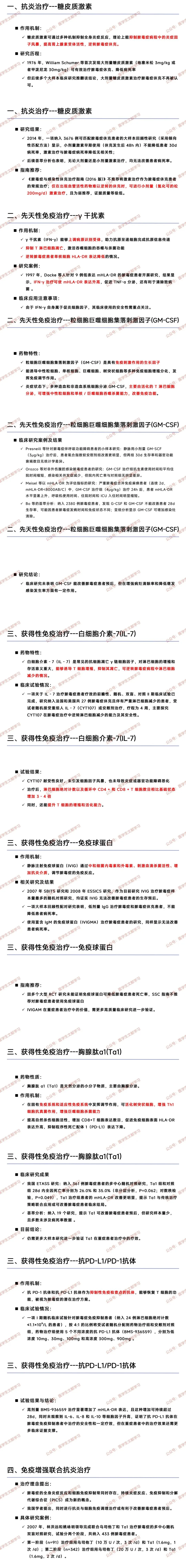- γ 干扰素(IFN-γ):上调病原识别受体、抑制 T 细胞凋亡、激活吞噬细胞功能、逆转单核细胞 HLA-DR 低表达;1997 年小样本研究(9 例)显示其可改善免疫指标,但自身为促炎因子,需重点关注安全性。