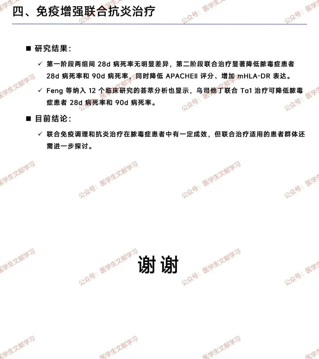 - 研究案例:我国多中心研究(433 例)显示,乌司他丁(抗炎)联合胸腺肽 α1(免疫增强)可降低脓毒症患者 28d/90d 死亡率,改善 APACHEⅡ 评分与 mHLA-DR 表达;荟萃分析支持该联合方案的有效性,但适用患者群体需进一步明确。