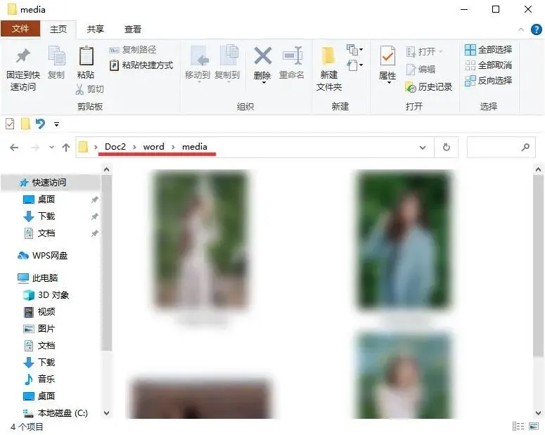 其实,只需复制Word文件,将文件后缀改为“.rar”,然后解压这个文件夹。依次打开“word”、“media”,就可以看到Word里的所有图片了。