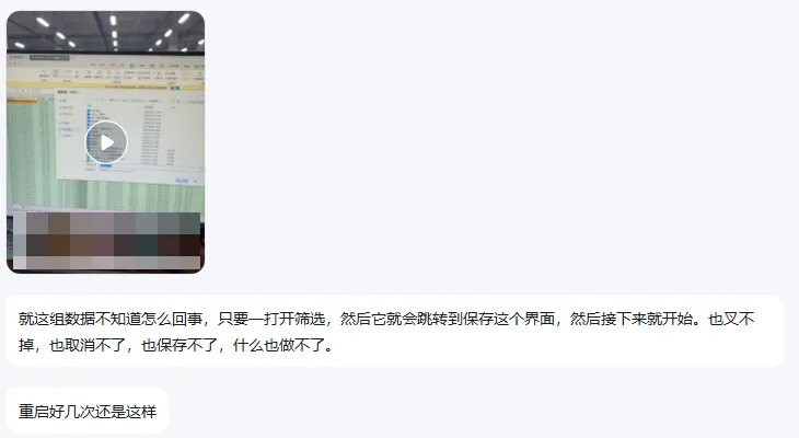 这组数据不知道怎么回事,只要一打开筛选,然后它就会跳转到保存这个界面,然后接下来就开始。也删不掉,也取消不了,也保存不了,什么也做不了。
