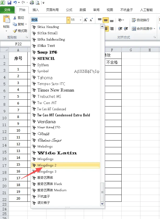 2、点击开始,选择Wingdings 2字体。