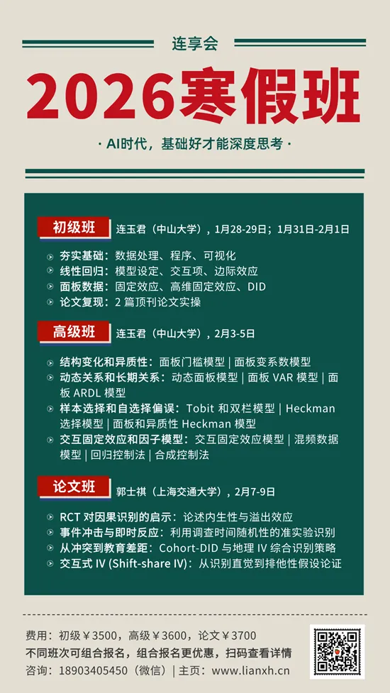 🍓 课程推荐:连享会 · 2026寒假嘉宾:连玉君 (中山大学);郭士祺(上海交通大学)时间:2026 年 1 月 28 - 2 月 9 日咨询:王老师 18903405450(微信)
