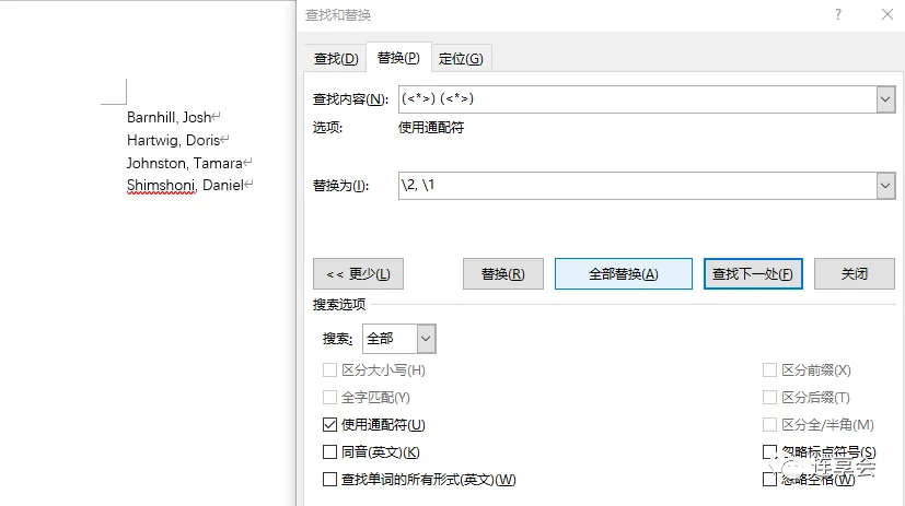 第五步,在「替换为」框中,键入 \2, \1。注:在逗号和第二个斜杠之间包含了空格。然后单击「全部替换」。Word 会转置这些姓名并使用逗号分隔它们。
