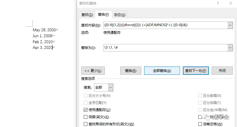 28th May 20031st Jun 20082nd Feb 20103rd Apr 2020第二步,按照上文描述打开「查找和替换」对话框,并选中「使用通配符」复选框。