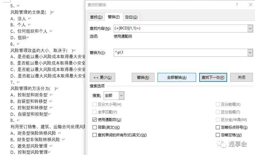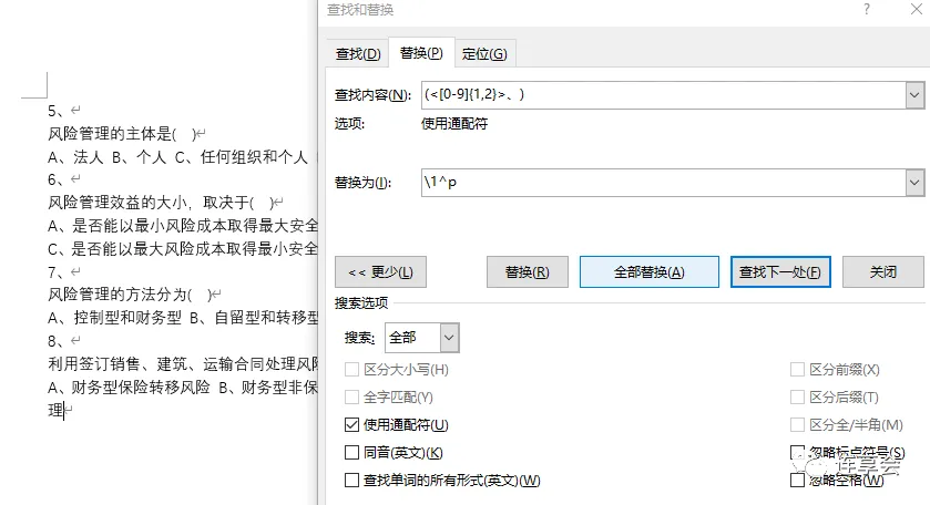 5、风险管理的主体是( )A、法人 B、个人 C、任何组织和个人 D、组织6、风险管理效益的大小,取决于( )A、是否能以最小风险成本取得最大安全保障 B、是否能以最小风险成本取得最小安全保障 C、是否能以最大风险成本取得最小安全保障 D、是否能以最大风险成本取得最大安全保障7、风险管理的方法分为( )A、控制型和财务型 B、自留型和转移型 C、控制型和转移型 D、自留型和控制型8、利用签订销售、建筑、运输合同处理风险的风险管理方法是( )A、财务型保险转移风险 B、财务型非保险转移风险 C、避免型风险管理 D、控制型风险管理第二步,按照上文描述打开「查找和替换」对话框,并选中「使用通配符」复选框。