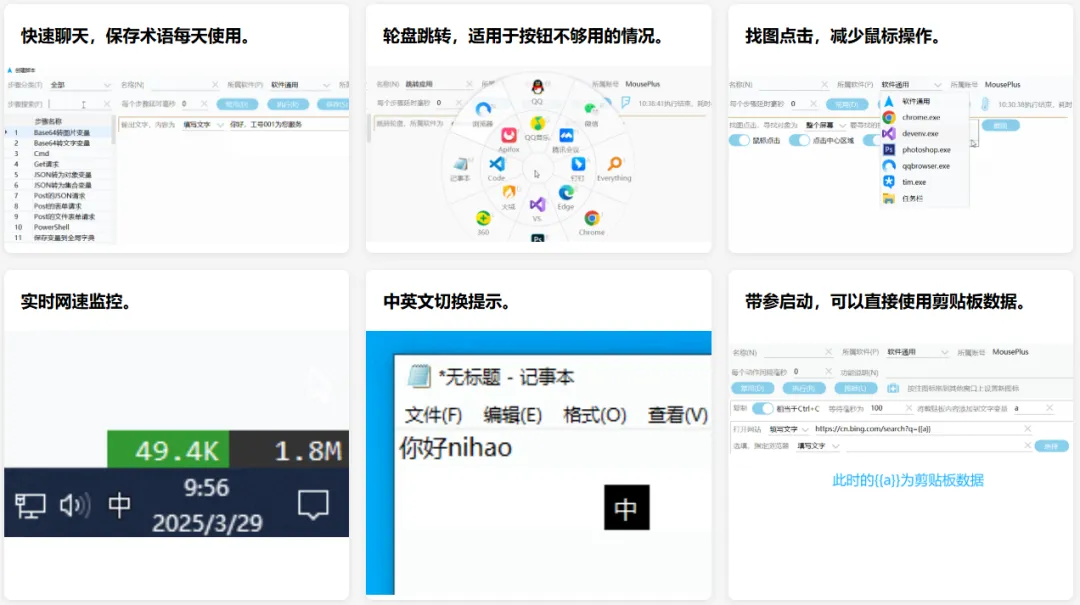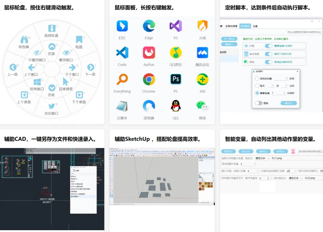 这是一款Windows下的鼠标增强工具,核心亮点是“右键轮盘”:按住右键轻轻一划即可呼出环形菜单,把常用的“关闭窗口、打开Everything、关屏、下一曲”等动作放进8个扇区,单手秒点完成,比记快捷键更直观。绿色单文件,不写注册表;支持为不同进程绑定专属轮盘,也提供左键长按、滚轮左右拨、中键点击等 10 余种手势,可自定义命令、按键或脚本,实现一键批量重命名、定时任务等高级玩法 。录制功能可把重复鼠标键盘操作录成宏,一键回放;窗口置顶、贴图、快速搜索等实用小功能也内置其中。兼容PS、CAD等设计软件,遇到Alt/Shift/Ctrl会自动暂停手势,不影响原有操作。如果你只想让鼠标变成效率遥控器,又不想装臃肿套件,MousePlus就是一个极佳的选择 #鼠标