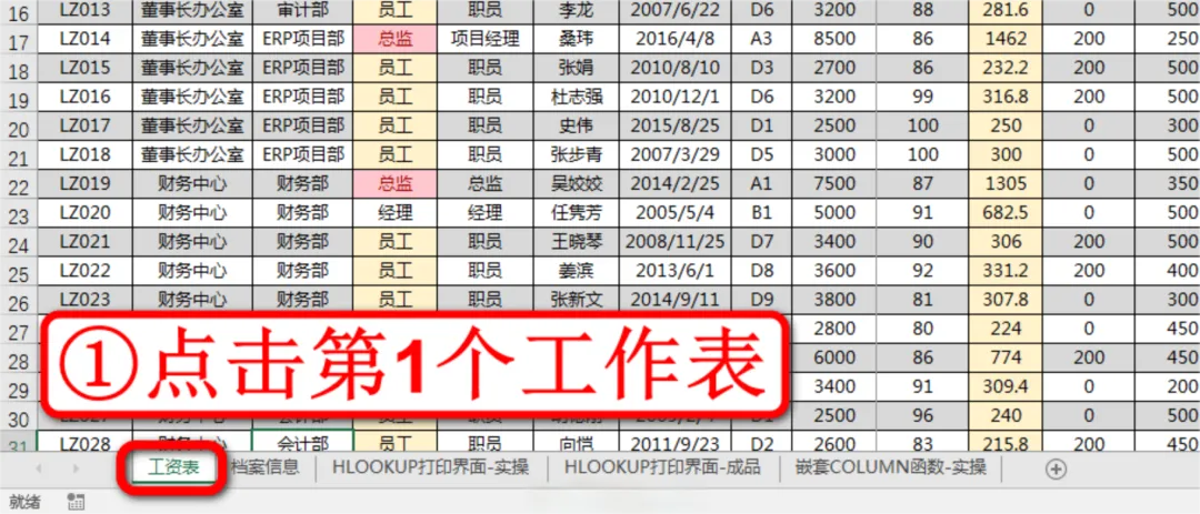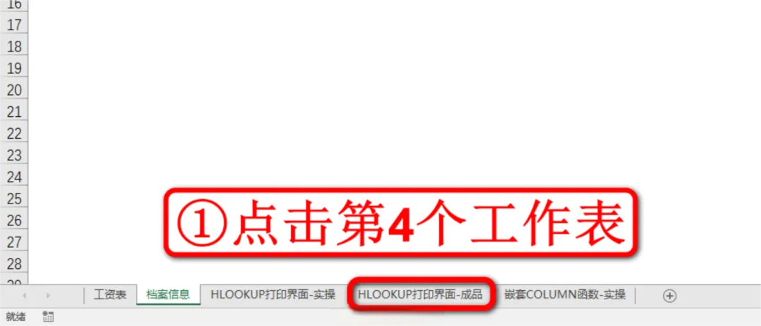 现在我们就到实操表中学习新函数,先点击左下角第3个工作表HLOOKUP打印界面-实操,如下图: