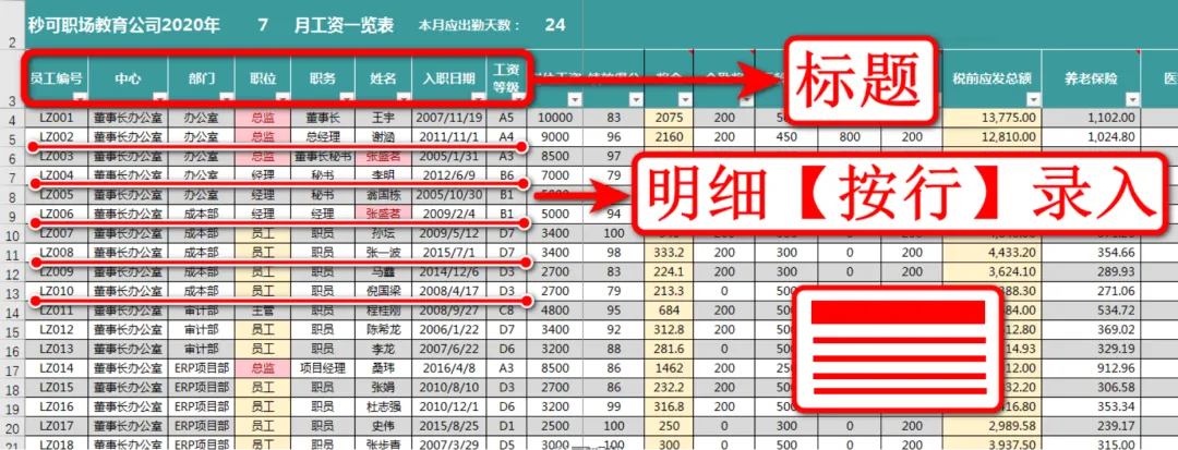 在学习新函数前,我们先来了解常见表格格式,你可以看到这个工资表,标题一整行在正上方水平列出,对应的每个明细的内容也是一行一行在下方录入,如下图: