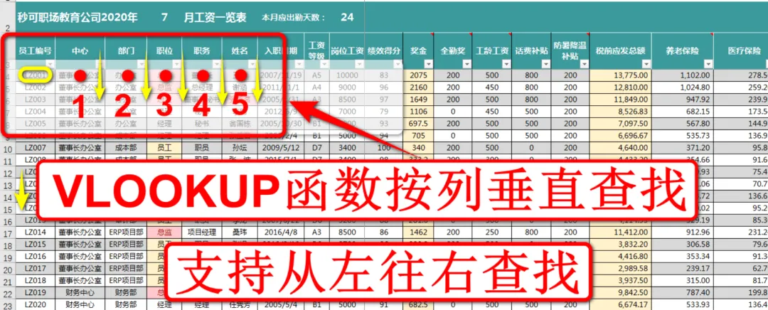 前面我们学习了VLOOKUP函数,这个函数是支持从左往右查找,按列查找信息,是属于垂直查找的函数,以下面的案例来说,查找每个员工编号对应的中心、部门、职位等信息,如下图: