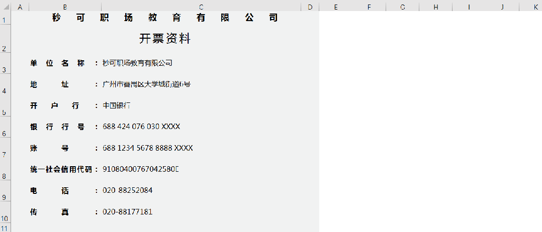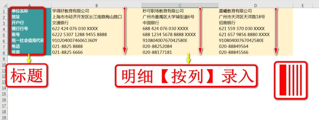这是三家公司的档案信息,数据罗列方式和前面小编推荐的完全不同,标题不在一整行,而是在一整列垂直列出,对应的明细也是按列书写的,如下图: