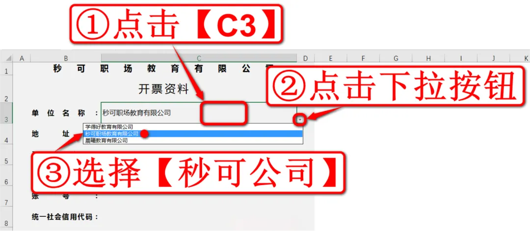 点击C3单元格,点击单元格右侧的下拉按钮,选择不同的公司,表格下方的信息也会自动同步内容,如下动图: