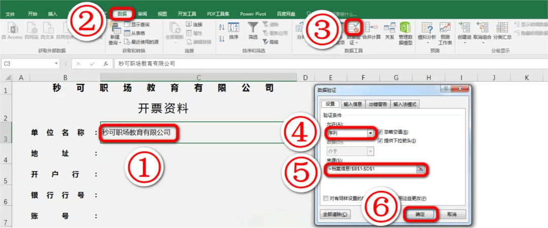 温馨提示:数据验证的方法前面已经学过啦,如果你想不起怎么设置,就看这里哦~ 点击C3单元格,点击数据选项卡,点击数据验证图标,选择序列,选择对应选项的单元格区域,最后点击确定,如下图: