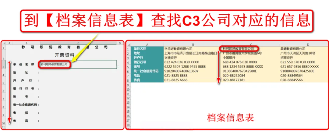 现在要以C3单元格为查找依据,到档案信息表中查询该公司对应的信息,如下图: