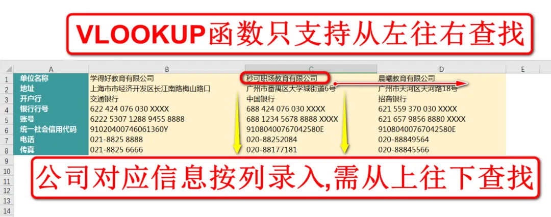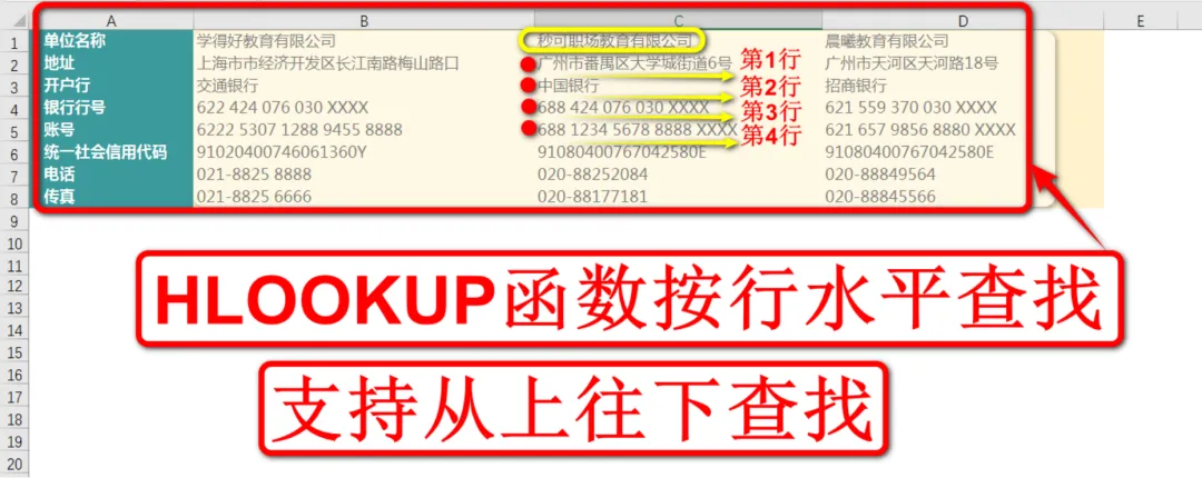此时就需要学习一个新的查找函数了,是它的兄弟函数HLOOKUP函数,支持水平查找,从上往下查找,以档案信息为例,要查找秒可公司对应的地址、开户行、银行行号等信息,就要从上往下,一行一行往下查找,如下图: