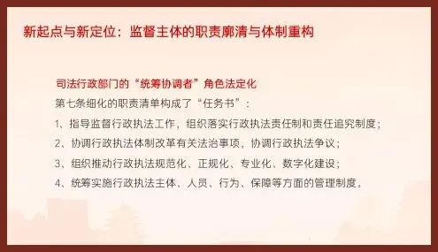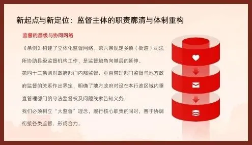《条例》第六条明确规定:“县级以上人民政府司法行政部门是本级人民政府的行政执法监督机构,代表本级人民政府承担行政执法监督具体事务。” 这一规定具有里程碑意义。它从国家立法层面,确立了司法行政部门在行政执法监督工作中的主体地位和法定职责。这意味着,司法行政部门不再是简单配合或协助,而是代表本级政府,承担起统筹、组织、实施、指导行政执法监督工作的主体责任。