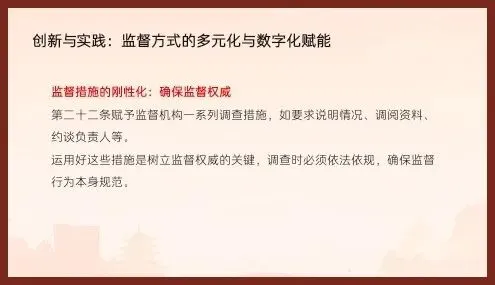 3.推动建设,提升能力:组织推动行政执法规范化、正规化、专业化、数字化建设。监督不仅是“找问题”,更是“促建设”,要通过监督推动执法队伍、执法程序、执法手段的全面升级。