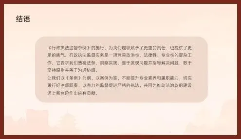 今天的课程,我将结合《行政执法监督条例》(以下简称《条例》)的重点内容,以及我们手头一批极具代表性的典型案例,和大家一起深入剖析行政执法监督“谁来监督、监督什么、怎么监督、监督之后怎么办”这一系列实务问题。我们的目标是通过学习,不仅掌握《条例》的法条文本,更能理解其精神内涵,并将其转化为有效开展监督、提升执法质效的实际能力。