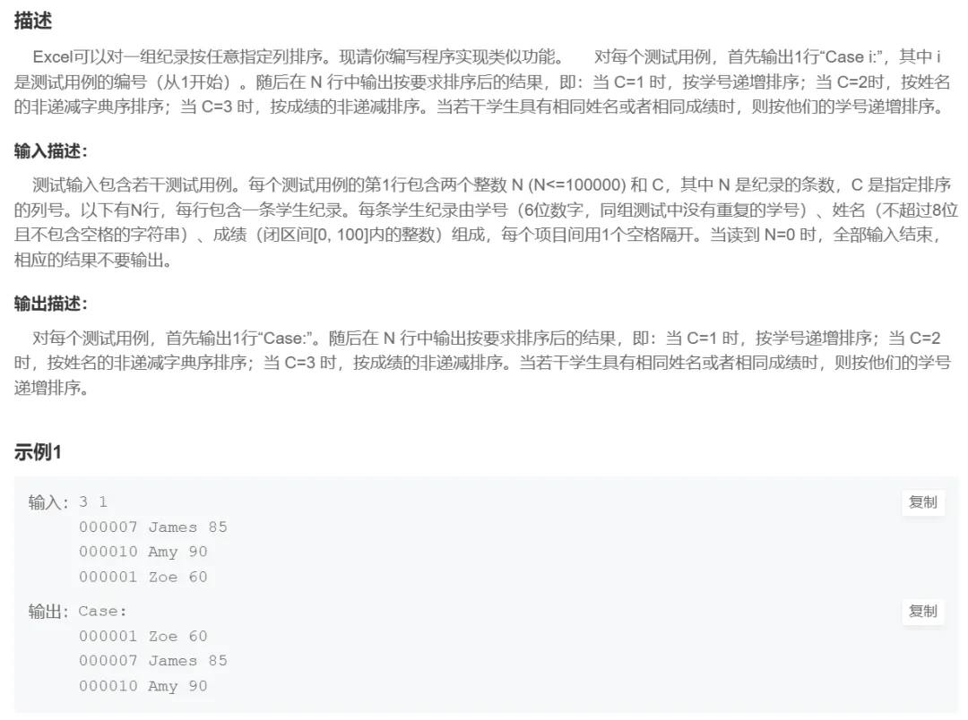 #include<iostream>#include<algorithm>using namespace std;const int N = 100010;struct stu { string id, name; int score;}s[N];intmain(){ int n, c; while(cin >> n >> c) { for(int i = 0; i < n; i++) cin >> s[i].id >> s[i].name >> s[i].score; sort(s, s + n, [c](const stu& s1, const stu& s2) { if(c == 1) return s1.id < s2.id; if(c == 2) { if(s1.name != s2.name) return s1.name < s2.name; else return s1.id < s2.id; } else { if(s1.score != s2.score) return s1.score < s2.score; else return s1.id < s2.id; } }); cout << "Case:" << endl; for(int i = 0; i < n; i++) cout << s[i].id << " " << s[i].name << " " << s[i].score << endl; } return 0;}