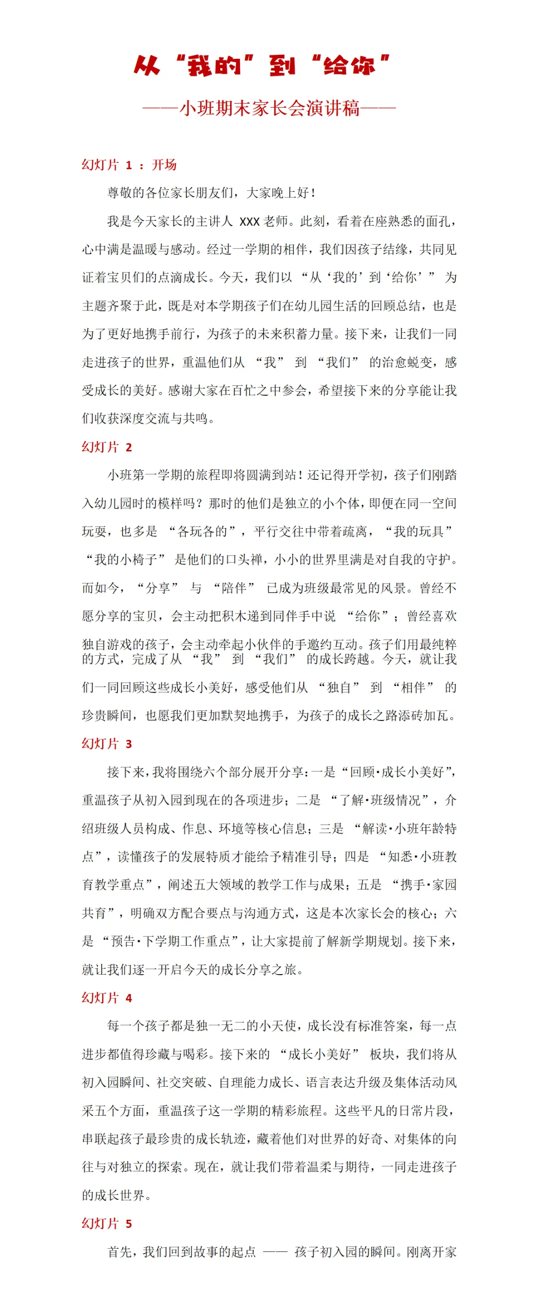 >小班上学期期末家长会《从我的到给你》ppt+发言稿
