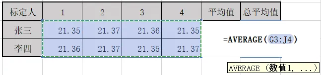 例2: AVERAGE (G3:J4)表示把G3到J4的单元格的内容进行求平均值;