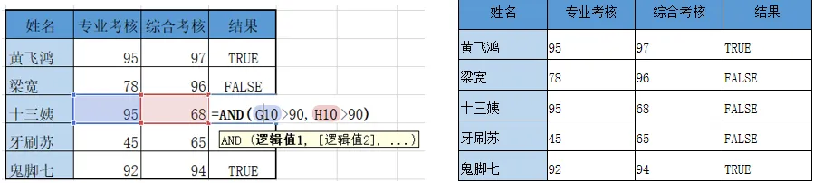 例2:专业考核成绩和综合考核成绩均大于90分时,TRUE(真),否则为FALSE(假)