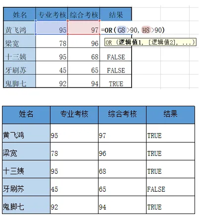 例2:专业考核成绩和综合考核成绩至少有一项大于90分时,TRUE(真),否则为FALSE(假)