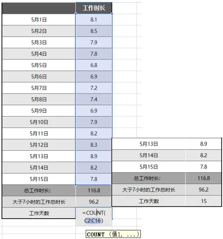 例2: COUNT(C2:C16)表示把C2到C16的区域内数值有多少个。8、条件统计函数COUNTIF