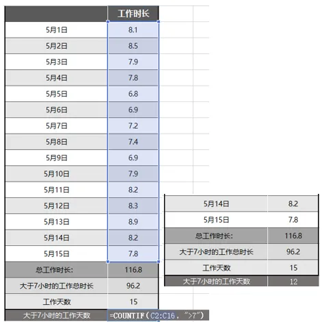 例2:COUNTIF(C2:C16,”>=7”)表示求C2到C16的区大于等于7的数值的个数;