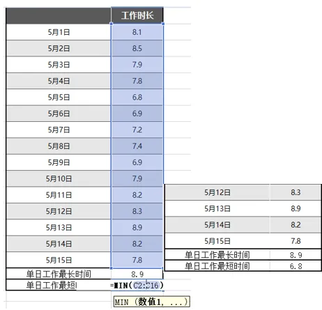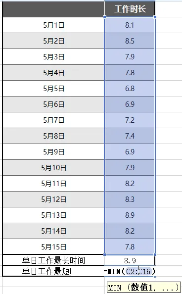 例2:MIN(C2:C16)求在C2:C16这个区域内最小的数值是什么?