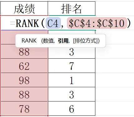 例:=RANK(C4,$C$4:$C$10)表示C4这个单元格内的数在C4:C10这个区域所有的数中排在什么位置。今天的公式就介绍这么多,大家有疑问可以在评论区留言!