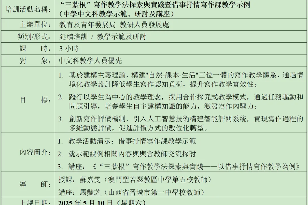 鼓勵教師參與聯校觀課活動,分享教學見解,在觀摩與研討中互學共進,拓寬教學視野;組織全澳公開課及對應講座,促進教學交流與專業發展。公開課《借事抒情寫作教學》(2025年5月10日)緊扣學生寫作現實困境,挑戰寫作教學難點,從教學內容到活動形式,設計精當,實施流暢,充分展現了團隊智慧與教研深度,得到了觀課教師的一致好評;配套講座《“三紮根”寫作教學法探索與實踐》,闡釋了公開課背後的設計理念與實踐邏輯,論證了“紮根自然、紮根社會、紮根課本”寫作教學路徑的可行性,實現了實踐展示與理論昇華的有機結合。