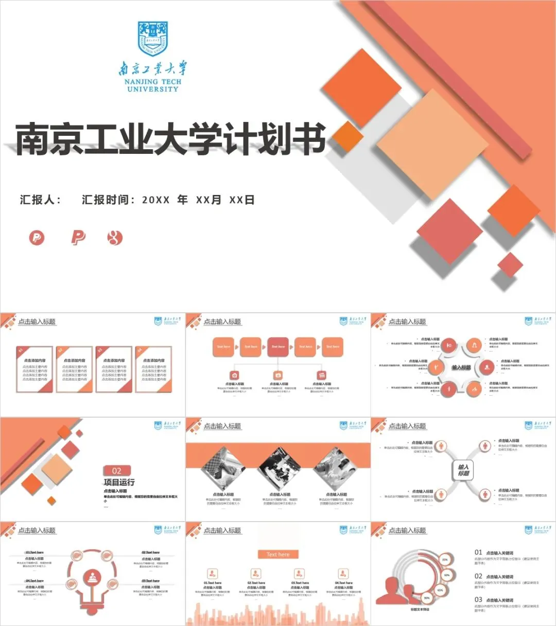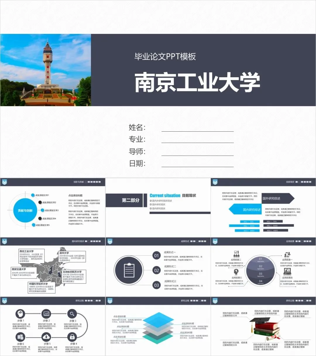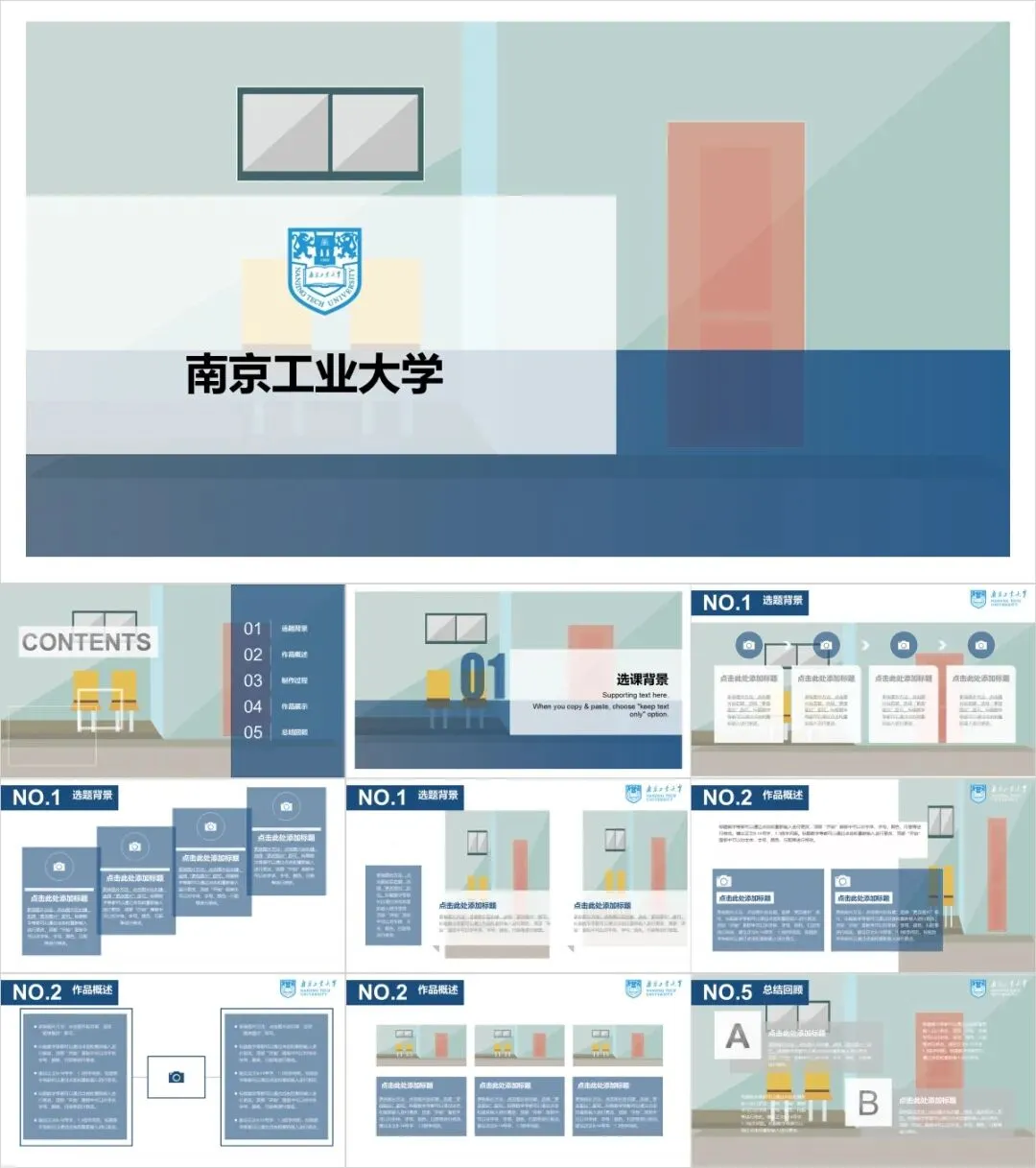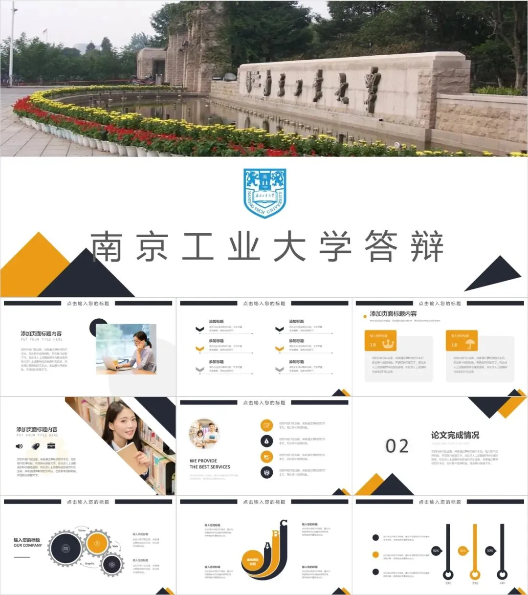 以上是我们为大家准备的南京工业大学专属PPT模板,文中的所有板式都是可编辑的,大家可以上传替换自己喜欢的校园美景,做出具有自己风格的专属PPT哦!其他同学也可以给我留言