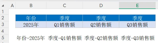 =TOROW(B2:E2&"-"&B3:E3)B2:E2&"-"&B3:E3,先用连接符&将上下两行对应的表头区域用-拼接。TOROW函数拼接后的数组如图所示,年份-2025,季度-Q1销售额……当表头内容发生变化时,函数结果会自动更新。