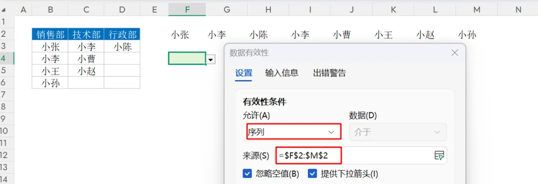 $F$2:$M$2区域,这样一个包含所有员工的下拉选项就做好了。