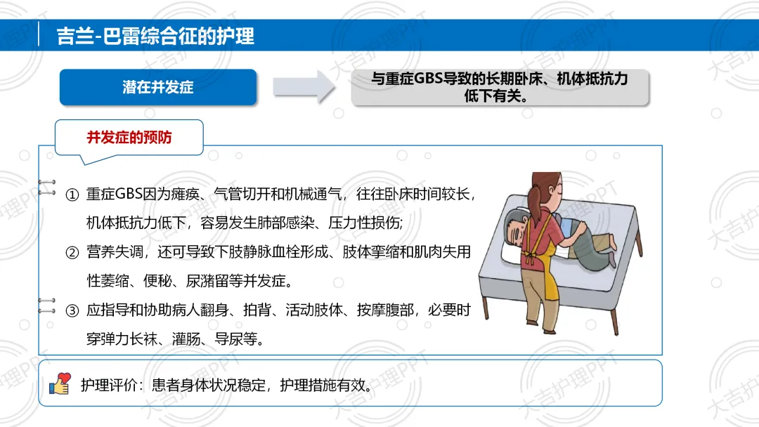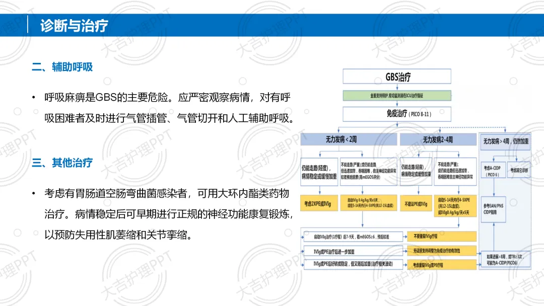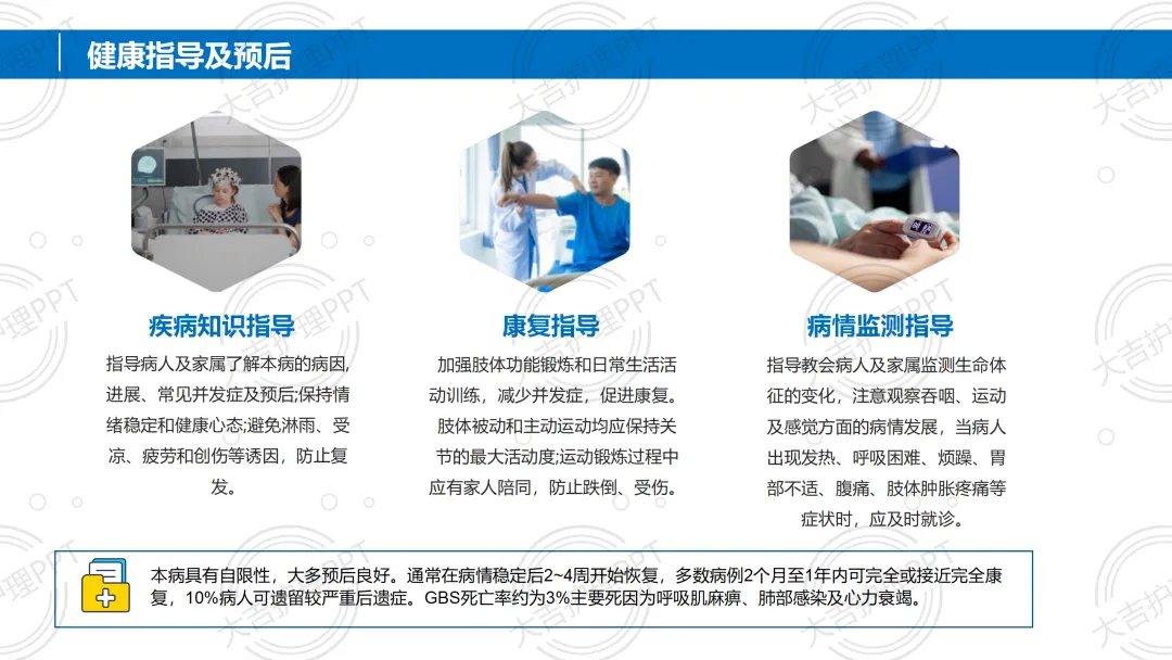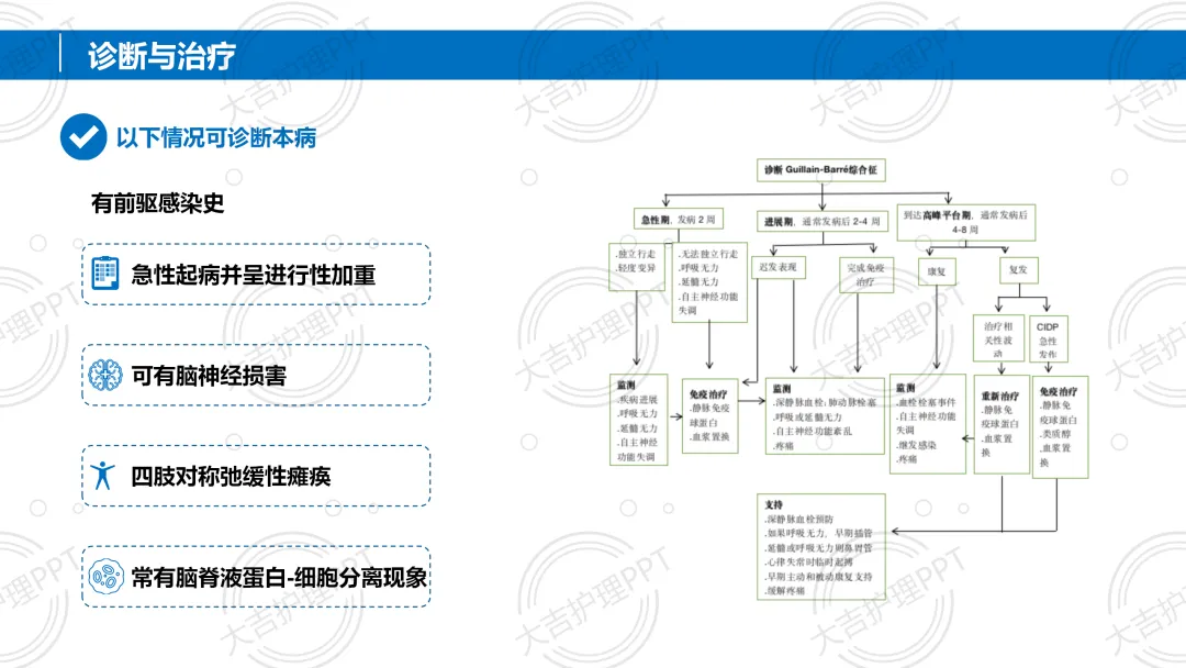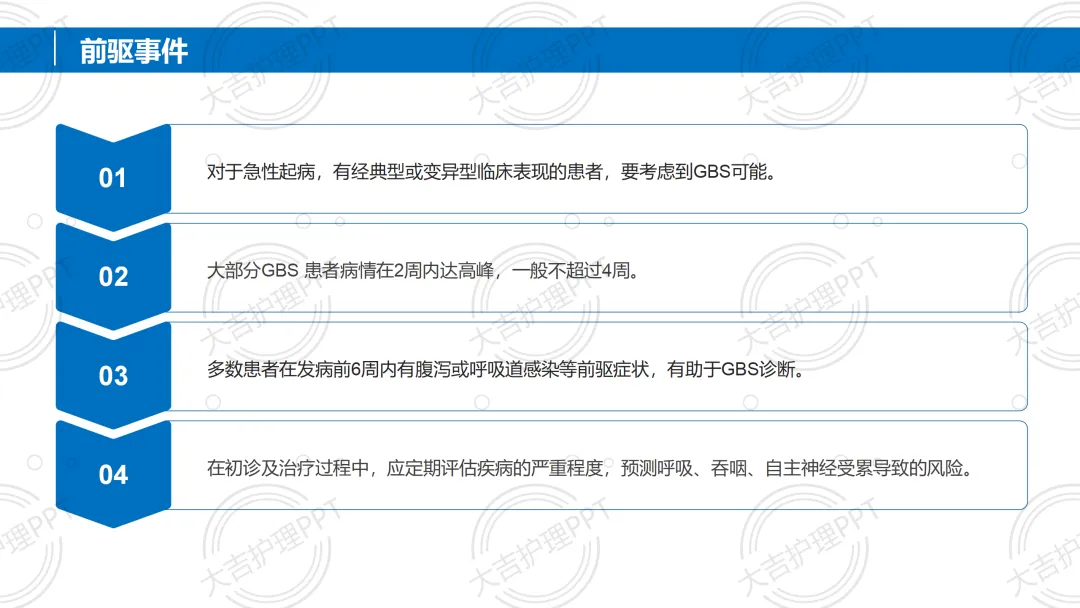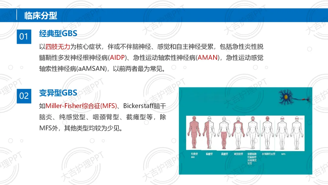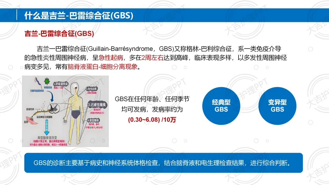 吉兰 - 巴雷综合征(GBS)是免疫介导的急性炎性周围神经病,任何年龄均可发病,多有感染前驱史,以急性起病、四肢对称弛缓性瘫痪为核心症状。诊断需结合病史、体格检查及脑脊液等辅助检查,治疗以免疫治疗、辅助呼吸为主,配合针对性护理,多数患者预后良好,部分可能遗留后遗症。。