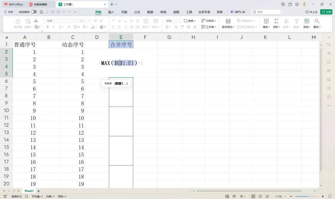 MAX($E$1:E1)+1"。