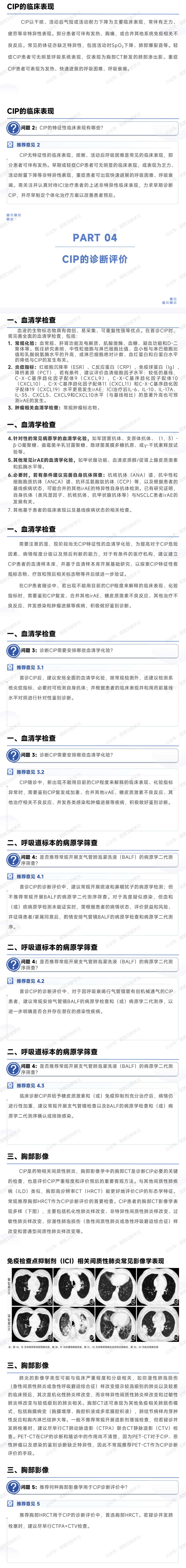 推荐恶性肿瘤患者接受抗肿瘤 ICI 治疗前,进行详细的问诊、体格检查、胸部影像及肺功能检查,以识别导致 CIP 的高危因素;对 CIP 高危患者加强宣教、并密切监测 ICI 治疗后的临床表现及指脉氧饱和度(SpO₂)、影像学变化等。