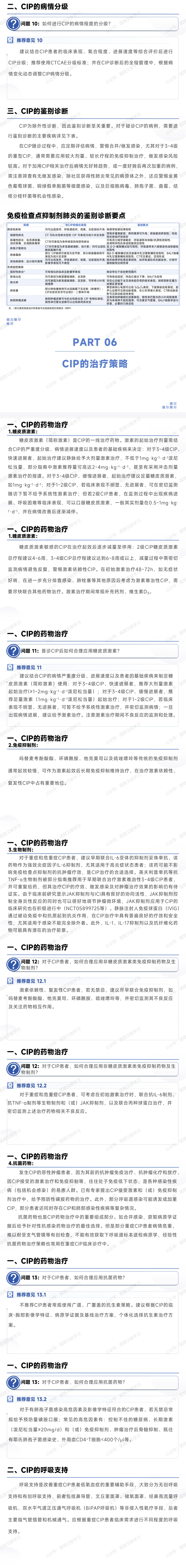 建议结合 CIP 患者的临床表现、氧合程度、进展速度等综合评价后进行 CIP 分级;推荐使用 CTCAE 分级标准;并在 CIP 诊断后的全程管理中,根据病情变化动态调整 CIP 病情分级。