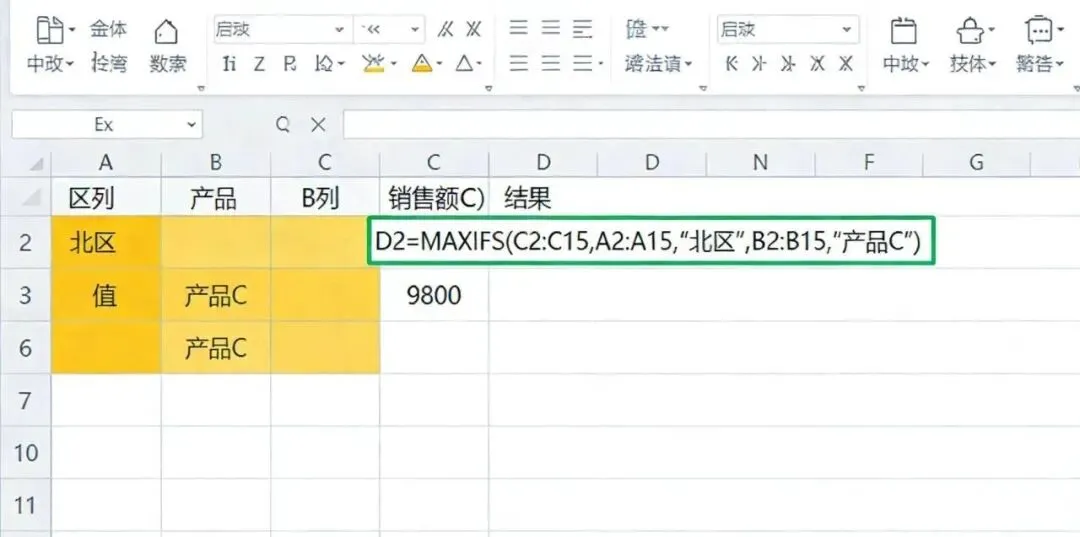 - 操作步骤:选中结果单元格,输入公式 =MAXIFS(最大值区域,条件区域1,条件1,条件区域2,条件2) ,比如 =MAXIFS(C2:C15,A2:A15,"北区",B2:B15,"产品C") ;C列是销售额,A列是区域,B列是产品名称;按下回车,即可直接得出北区产品C的最高销售额;如需查找最小值,替换为MINIFS函数即可