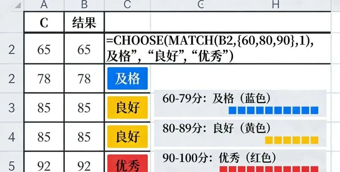 - 操作步骤:选中结果单元格,输入公式 =CHOOSE(索引值,选项1,选项2,选项3……) ,比如 =CHOOSE(MATCH(B2,{60,80,90},1),"及格","良好","优秀") ;先通过MATCH函数将分数B2转换为对应索引值,再用CHOOSE函数匹配等级;按下回车,即可根据分数快速返回对应等级;可按需扩展选项数量,适配更多值的匹配场景。