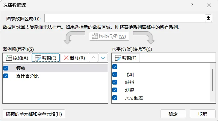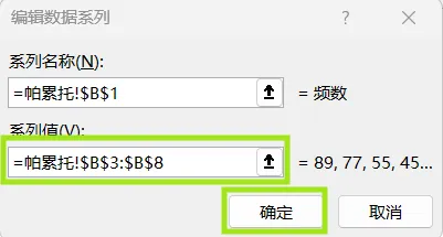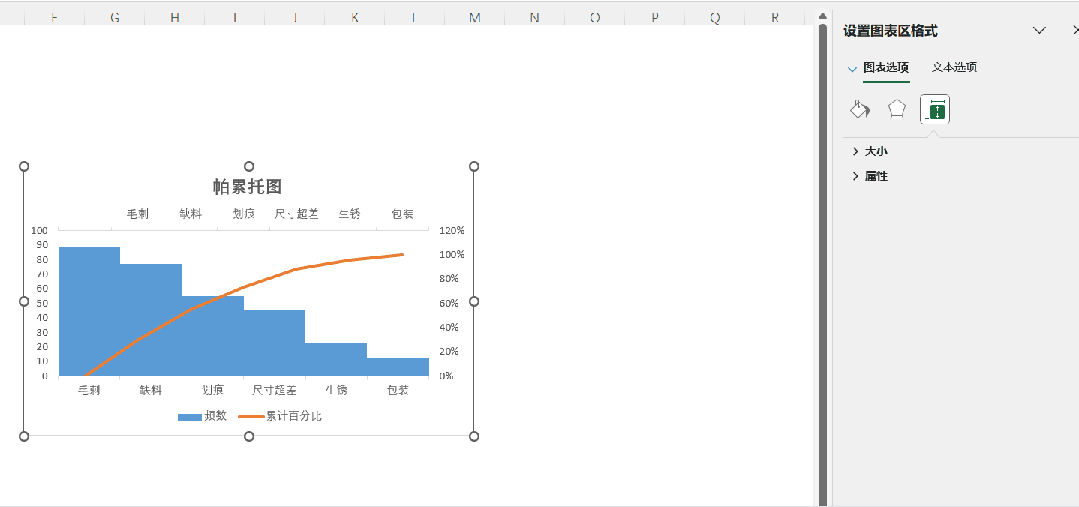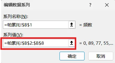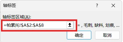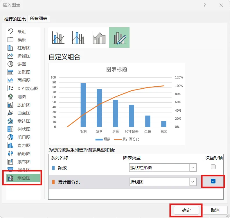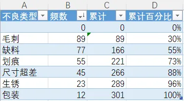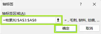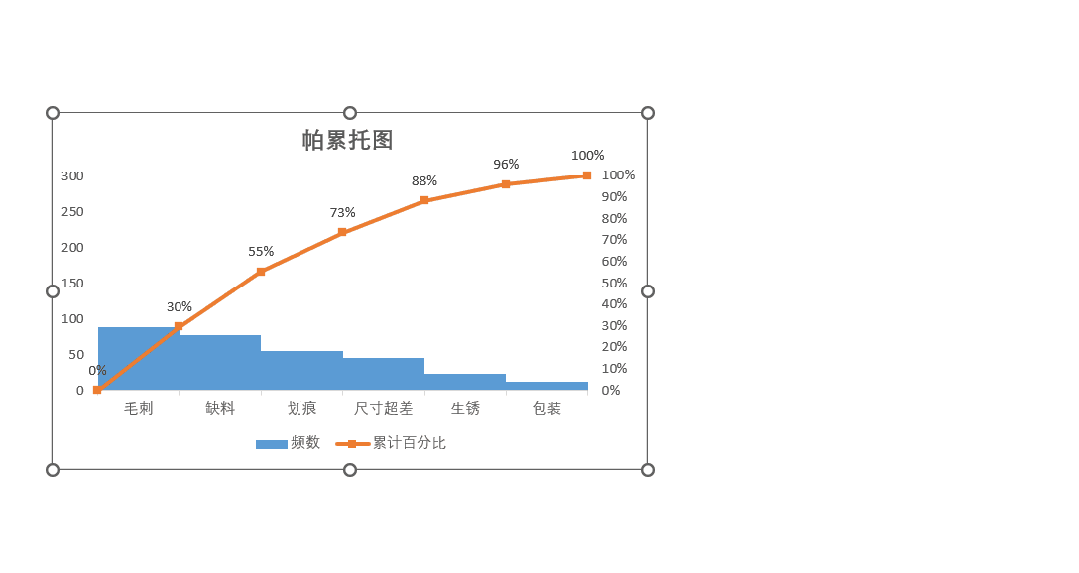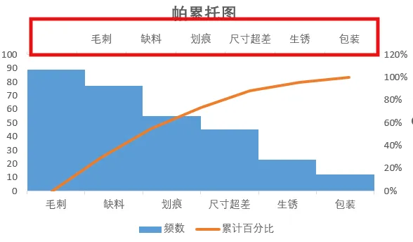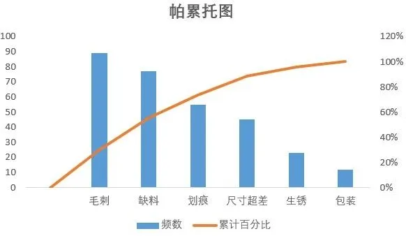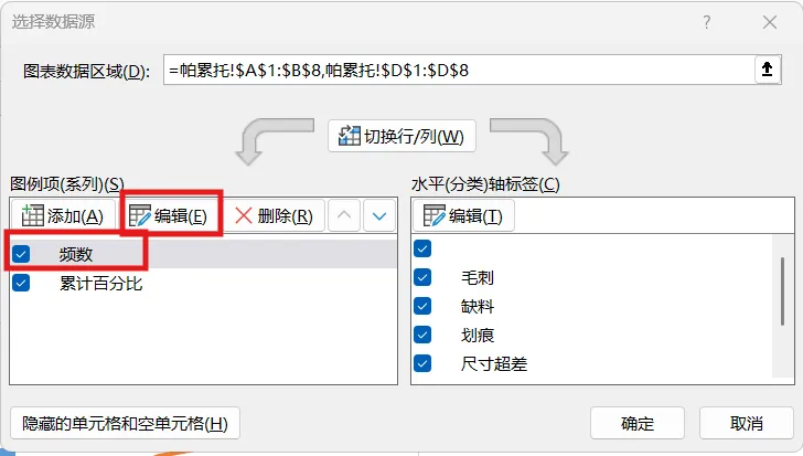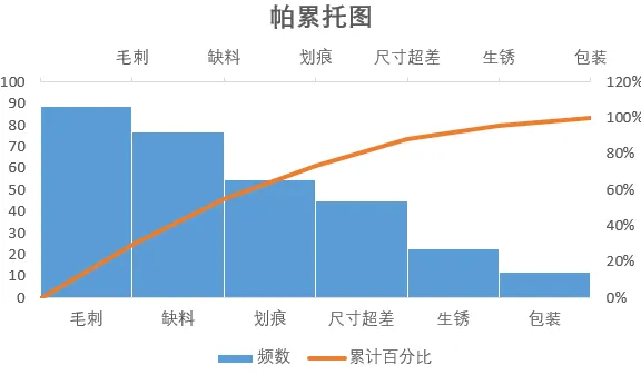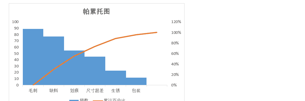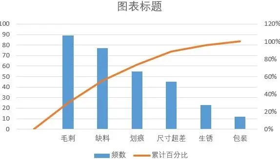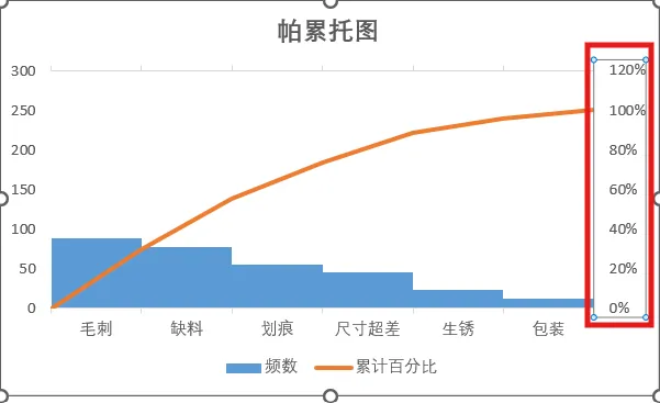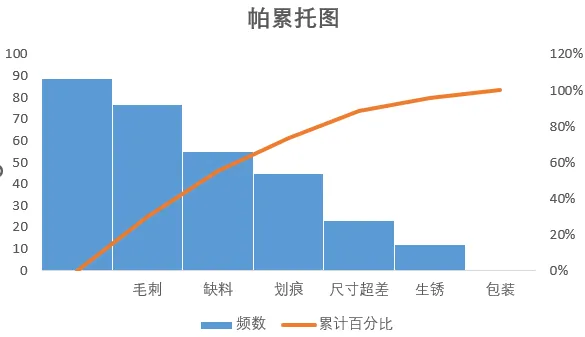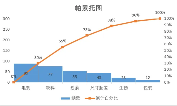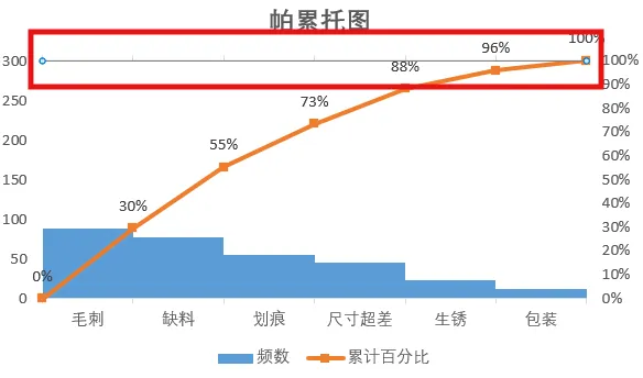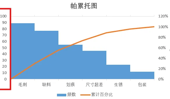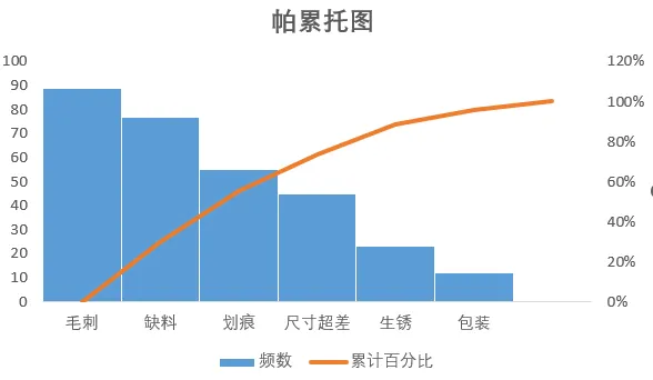 2.数据整理完成后。插入图表,选择组合图,频数选择簇状柱形图,累计百分比选择折线图,勾选次坐标轴,点击确定。现在,出现一个帕累托的雏形,制作帕累托图的关键点是柱形与折线都需从0开始,折线穿过第一个柱的右上角,调整柱子之间的间距为0。显然下面这个图表是不符合要求的。3.本人不太喜欢网格线,所以我会删除它。将图表的名称改为帕累托图4.调整柱状图的间距将间隙宽度改为0% 边框改为实线白色。操作完成之后,它是这样的,如下图所示,我们发现,折线与柱状图都不是从0开始。5.现在我们需要更改数据范围,选中柱状图点击“选择数据,出现下面的窗口,选择频数点击编辑。将数据的范围从 =帕累托!$B$2:$B$8 改成 =帕累托!$B$3:$B$8,然后点击确认。现在你的图表应该长这样了,如果不是请检查上面的步骤哟。6.水平分类轴的标签 点击编辑将数据范围从“ =帕累托!$A$2:$A$8” 改成“ =帕累托!$A$3:$A$87.现在柱状图从零开始了,但是折线图还不太对劲。现在我们需要添加次要坐标轴右键选中该坐标,设置坐标轴格式,坐标轴位置 选择在刻度线上。标签位置选择为无8.可是我们发现折线并没有从第一个柱子的右上角穿过,怎么办呢?将最小值改为0 最大值改为所有频数之和。我这里是301,所以就填写301。选择右边这列数据 将边办界更改为 最小值0 最大值1。设置折线图的数据点格式。找到标记选项选择内置。类型与大小,可以按自己的喜好去设定。图表的上方还有一条深色的直线非常的影响美观,我们可以将它的颜色设置为无颜色。“关于帕累托图,你还有什么想了解的?或者在用的过程中遇到过哪些问题? 评论区告诉我 吧!如果喜欢这篇内容, 点个关注 ,下次更新不迷路~