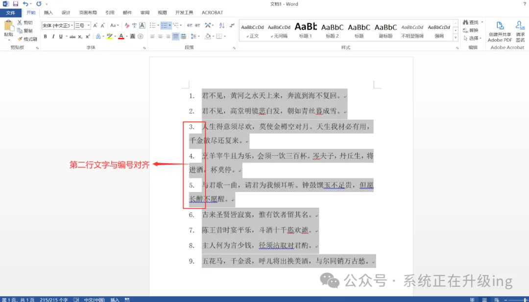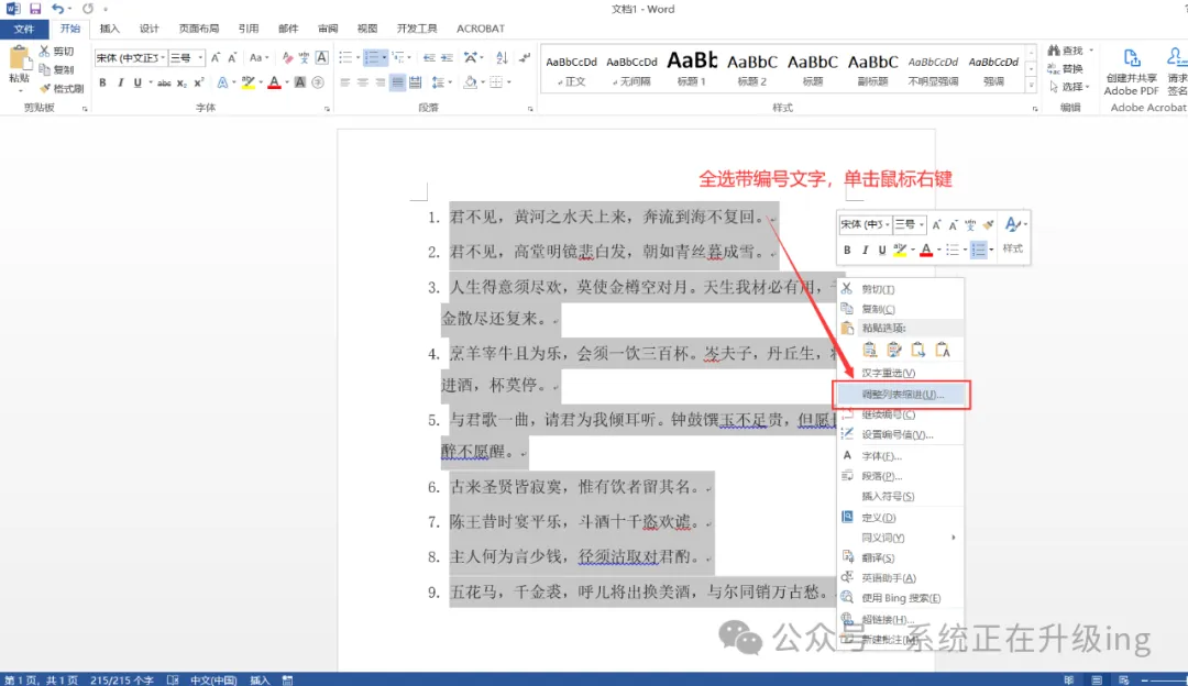 1、打开word文档,先按【Ctrl+A】全选带自动编号的文字,然后单击鼠标右键,在展开的菜单中点击【调整列表缩进】。