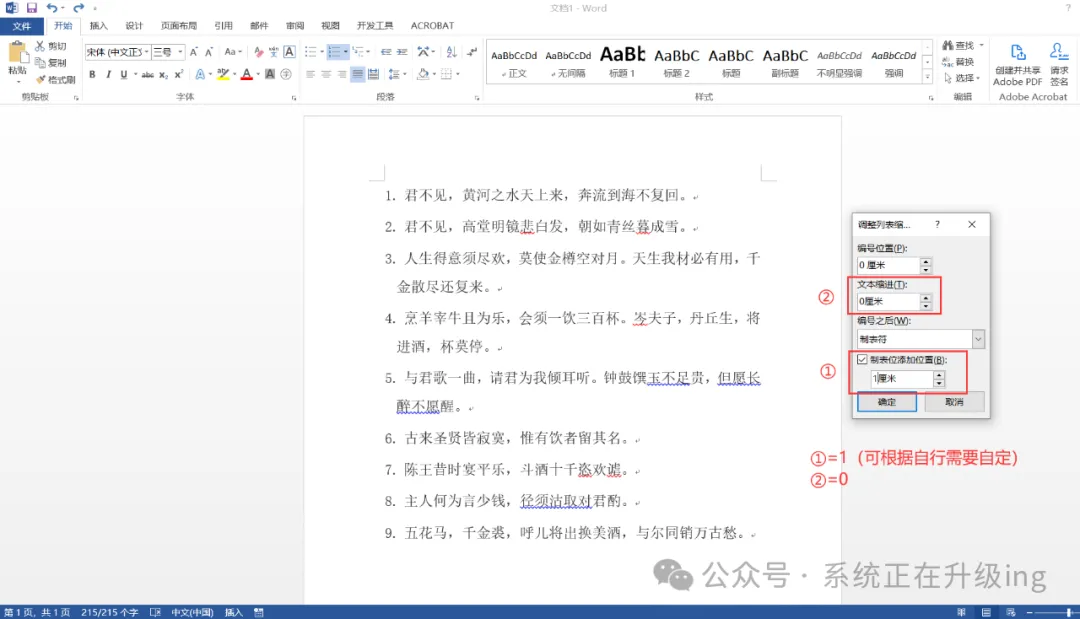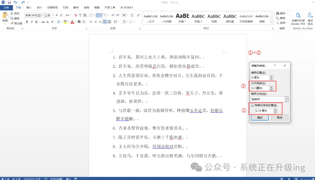 2、在弹出的“调整列表缩进”对话框中设置参数①②,设置完成,再点击【确定】。