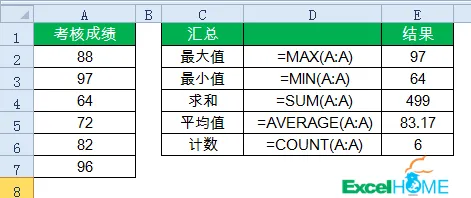 A列最小值:=MIN(A:A)