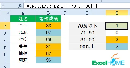 =FREQUENCY(B2:B7,{70;80;90})