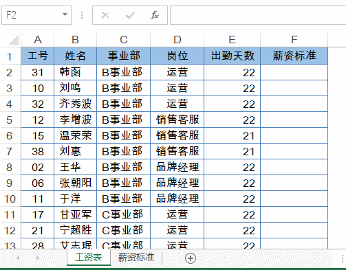 如下图,要从薪资标准表中,按照工号查找对应的薪资标准,一个VLOOKUP就够了。