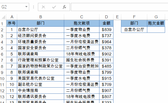 如果B列的部门等于F2单元格中的部门,就对D列对应的金额求和。
