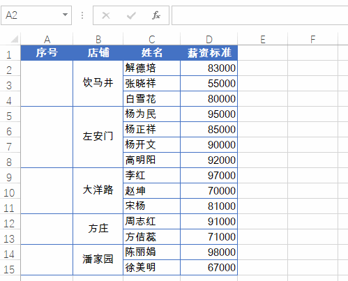 同时选中A2:A15单元格区域,编辑栏输入公式按Ctrl+回车: